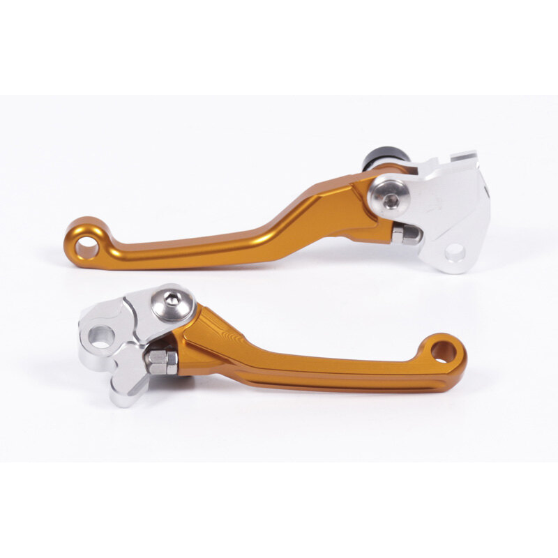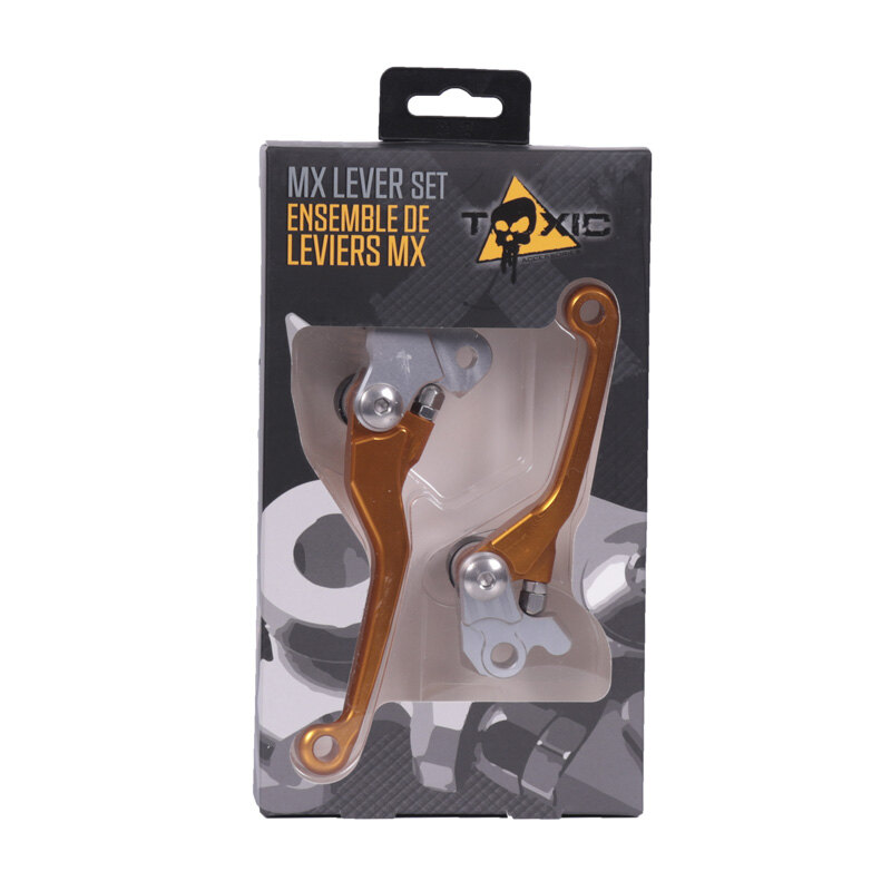Toxic CNC levers are made out of billet aluminum 6061 T6 with anodized finish for durability and long service life. Hardware is all made of stainless steel for good looks and durability. Adjustable reach for a custom fit. Folding design flexes during impact. With bolt and sleeve that exactly match the pivot diameter of the lever to eliminate almost all up or down play for an OEM bike fit. Sold by pair