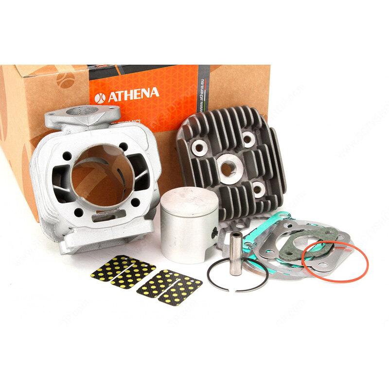 The kit includes the high-quality aluminum cylinder with increased bore, the cylinder head, the piston with flat head with the piston pin and rings, and all the necessary gaskets.