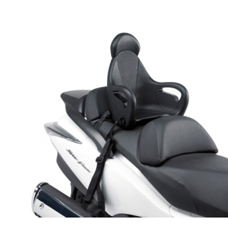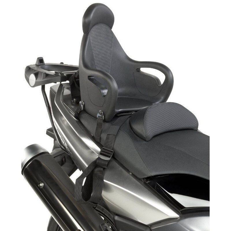 Adaptable to the majority of scooter models you see today, the KS650 ensures children from 5 to 8 years old have the right seating position. Made in foam polyurethane (black colour) with metal base, it is mounted using appropriate universal straps on the sides of the motorcycle. There is no seat belt which will keep the child tied to the seat (such as those found on bicycle seats), the mere presence of an adult on the front seat is enough to prevent the child from moving forward.