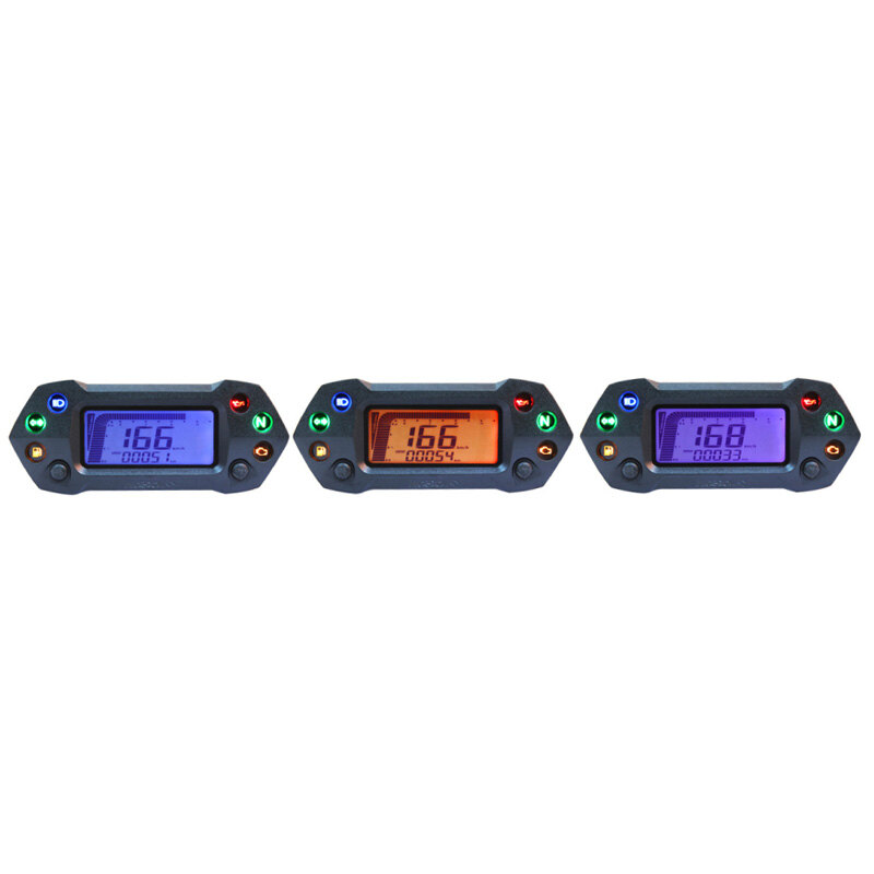 Our DB01R\ multifunction meter is an upgraded version of our popular DB01R multifunction meter. Perfect for motorcycles, street fighters or dualsports motorcycles, this meter features a large LCD display which uses a 3 different color changeable backlight to makes it easier to read during day or night riding. Get every information you need on this unique and lightweight meter that will enhance your motorcycle.