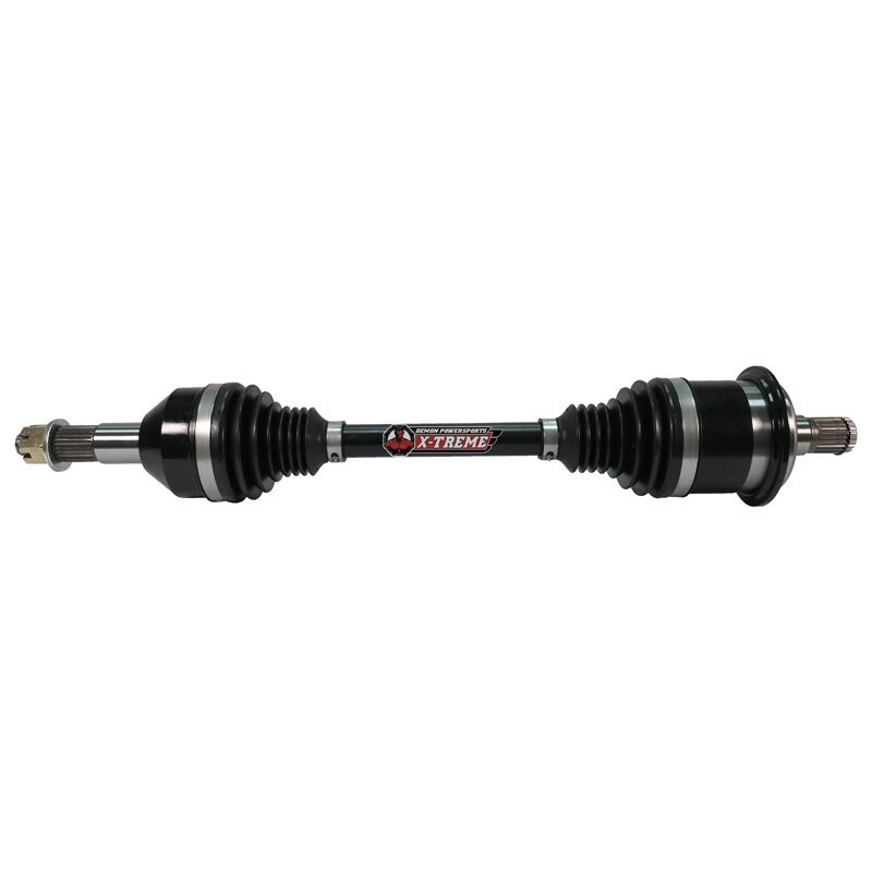 Entire Axle made up of 4340 Chromoly Steel Available in 300M shaft for select fitment Re-Engineered Cage Design to Enhance Durability 20 30% Larger components compare to HD All components of axles dual heat treated to increase strength Unique boot design depending on riding terrain for heat reduction High quality lithium based grease containing molybdenum with high drop point Larger swing angles up to 47 degrees Backed with a 2-years limited warranty Built for Extreme riders and machines with more power Our Strongest Axles To Date Available for Long Travel KitsOur X-Treme Heavy Duty Axles are Hell Rated upgraded from our Heavy-Duty Line to handle the harshest terrains for racing in Desert, Sand, Mud, Rock and Short Courses. Demon X-Treme Heavy Duty Axles are our strongest axles to date.Through years of research and development Demon Powersports has developed a RACE READY, ULTIMATE PERFORMANCE axle that doesnt burn a hole in your pocket and adheres to the highest quality standards.The success behind our products stems from thorough quality control. Our products go through extensive and extreme testing and R&D before launching. Available in 300M shaft for select fitment We re-engineered our cage design to enhance durability and use Molybdenum grease to lubricate the internal components. The axle\'s inner components are micro-polished, so the CVs don\'t heat up like other products.4340 chromoly steel is more elastic meaning the axle shaft and its components will absorb any stress and keeps it within itself, eliminating any stress from being transferred into the differential and through your drivetrain.Our X-Treme Heavy Duty Axles are tailored made to work with all major Long Travel Suspension Kits & Lift Kits. We understand the requirement for the desert and dunes.They are already optimized for heat so CVs can run cooler and last longer.Demon Xtreme axles come with an industry first 2yr limited warranty! We know our axles are built and designed for the maddest and toughest machines, thats why we have paired our axles with the best warranty in the industry!Our Racing Axle, now available in a sleek chrome finish that defines both style and durability.Race spec axle is our strongest Axles To Date and available with 300M shaft for select fitment. Our #1 priority here at Demon Powersports is your happiness. Which means we stand behind our products. If you have a problem, we will solve it.
