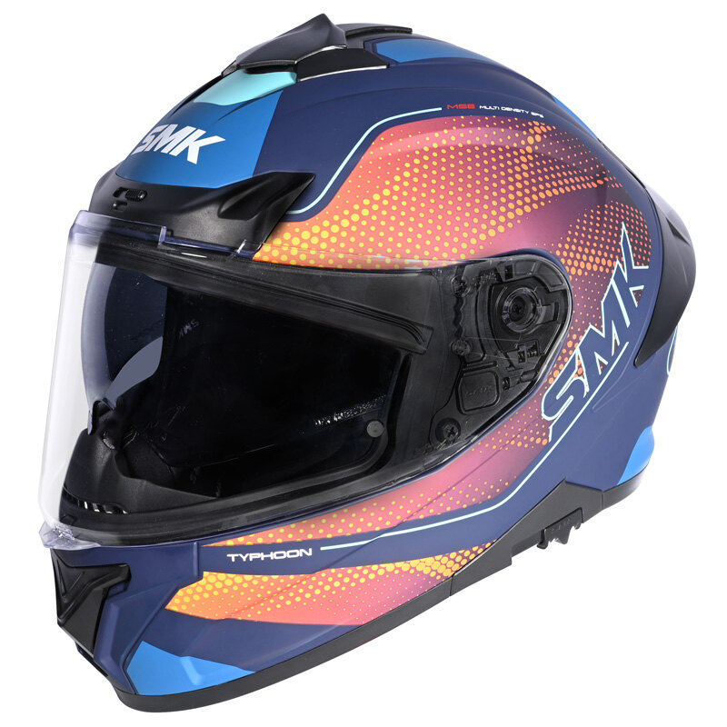 This full-face helmet with a compact and aerodynamic shell design appeals to sports tourers and daily commuters alike! The Typhoon helmet from SMK comes with industry-leading safety and comfort features. Enhanced with amazing graphics or plain solid colours, it gives you the option to pick one that matches your lifestyle! A complete ventilation system with vents on the mouth area, on the sides and top keeps you cool and comfortable on long rides. Original Pinlock® ready visor with an easy-to-use inner sun visor lets you enjoy your rides in total safety under all weather conditions.