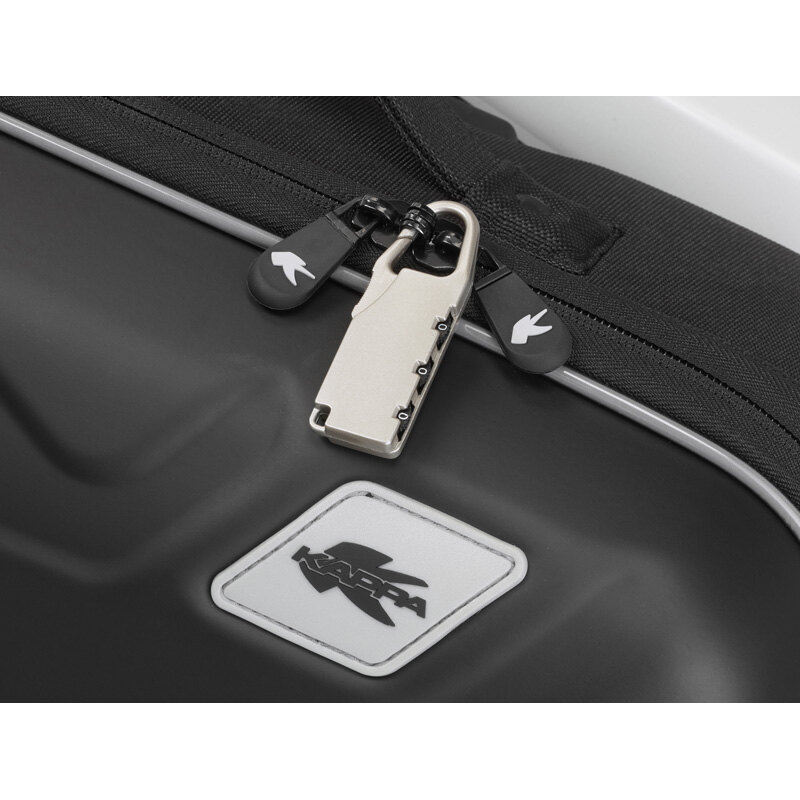 Pair of thermoformed side bags with the Easylock system and with a 17-litre capacity. Produced in materials researched and studied by our K LAB technicians, externally clad with 1000D polyester and EVA laminated polyester for the lining. It incorporates protective feet, rainproof cover and zip slider with a blocking lock. It is also supplied with a carrying handle, internal rubber bands to keep the load stable and a net compartment inside the lid.