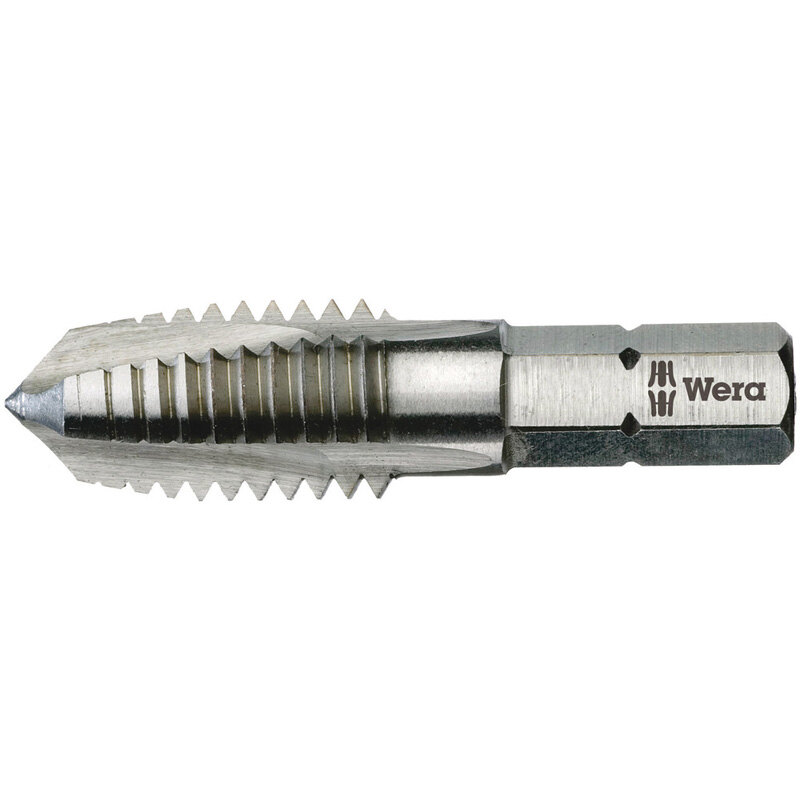 High quality tap cutting bit by Wera. To cut metric threads. The hexagonal shaft ensures very good power transfer. The finely-tuned material elasticity provides for great durability. Perfect chip removal and a low tilt risk. ¼" hexagon, suitable for holders as per DIN ISO 1173-D 6.3.